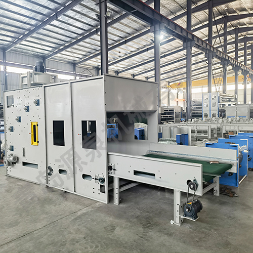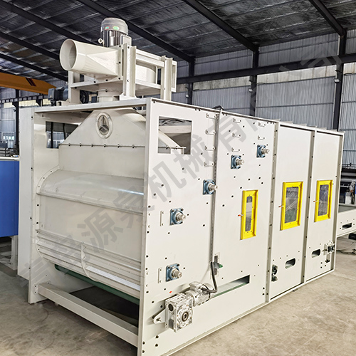 將開(kāi)包后稱(chēng)量分配好的纖維,喂入平簾輸送至主體混倉內,再由5道開(kāi)松輥高速開(kāi)松混合后,經(jīng)輸棉風(fēng)機以適量的風(fēng)量輸送纖維原料供后道工作使用。本機由雙電機控制五道開(kāi)松輥,轉速、運行更加穩定。