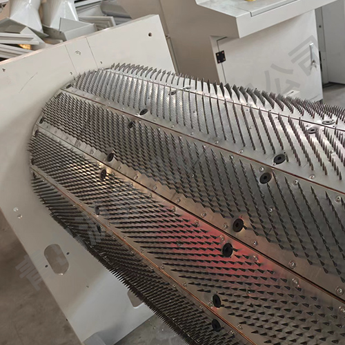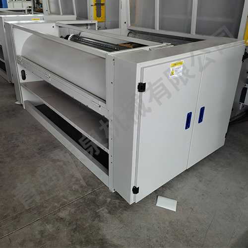 把纖維、原料經(jīng)喂入平簾輸送至喂入羅拉,再由開(kāi)松輥高速開(kāi)松后,經(jīng)輸棉風(fēng)機以適量的風(fēng)量輸送纖維原料供后遞工作使用。經(jīng)本機開(kāi)松后的纖維、原料效果好,均勻、細致。