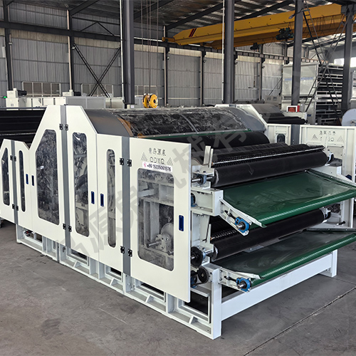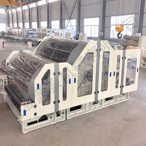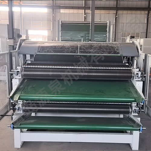 該機采用雙錫林梳理,雙道夫,雙雜亂出棉,雙羅拉剝棉,具有分梳能力強,梳理精度高等優(yōu)點(diǎn)。喂入羅拉分上下兩組配對,變頻調速,并裝有金屬探測裝置,具有自停報警功能。且自動(dòng)送入鋪網(wǎng)機斜簾,減輕操作工的勞動(dòng)強度。